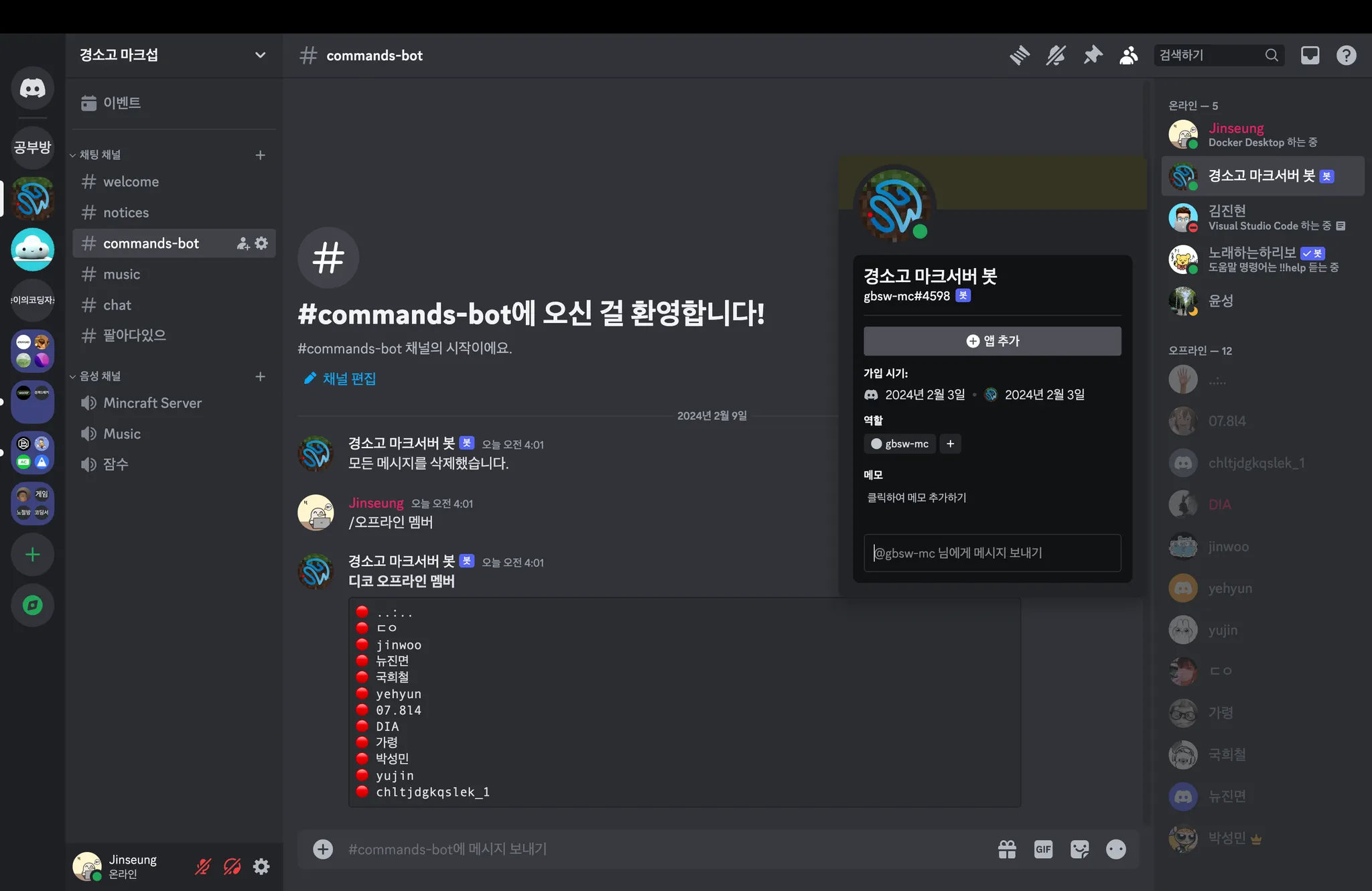 방학 중 친구들과 마인크래프트 서버를 운영하면서, 디스코드 서버를 효율적으로 관리할 필요성을 느꼈습니다. 수동으로 채팅을 관리하고 멤버 상태를 확인하는 데 시간이 많이 들었기에, 디스코드 봇을 개발해 서버 관리를 자동화하고 재미있는 커뮤니티 환경을 만들고자 했습니다.
